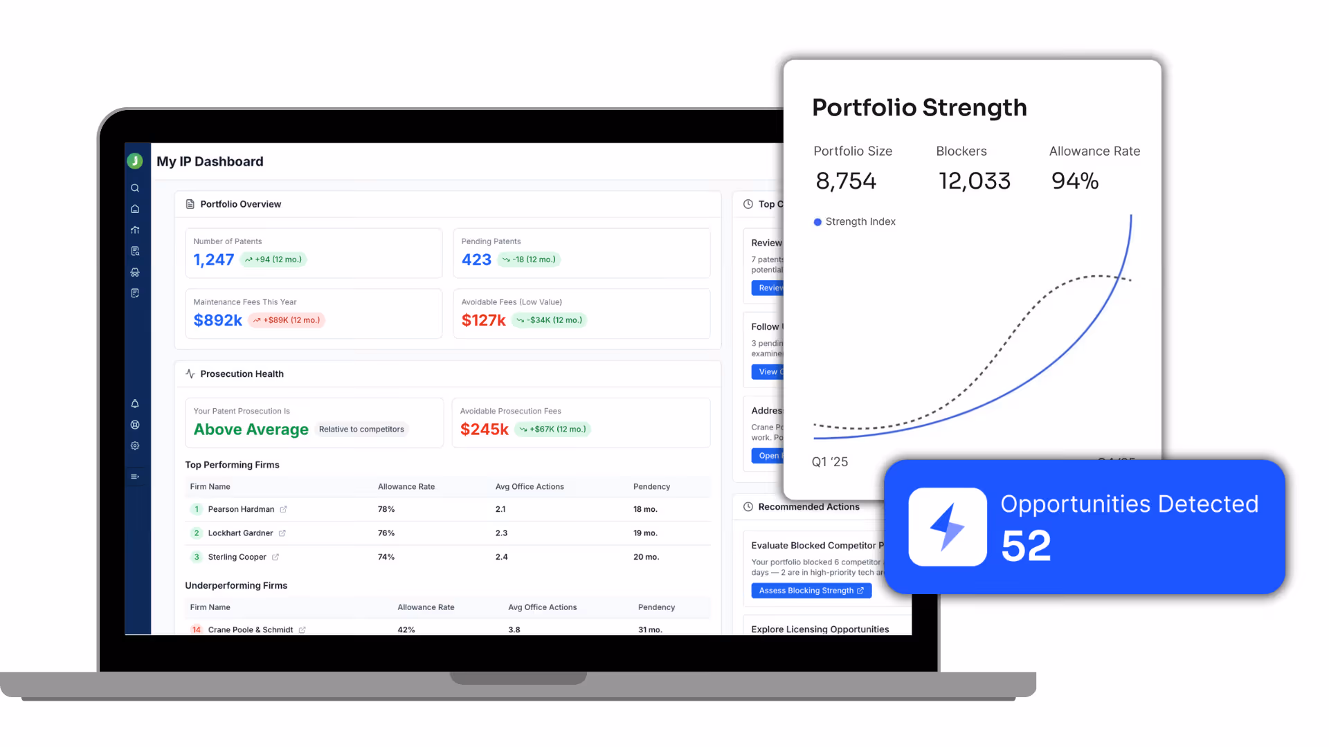 You’ll get examiner-specific stats, predictive filing outcomes, portfolio dashboards, and benchmarking across counsel and competitors.